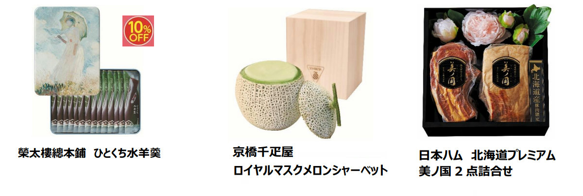 また6年目を迎える毎年人気の「アートコレクション」シリーズからは、名画をテーマにした「榮太樓總本鋪 ひとくち水羊羹」3300円(2970円、早期割対象7/8まで)、「夏のごちそう」シリーズからは銘菓の京橋千疋屋による「ロイヤルマスクメロンシャーベット」1万4000円、職人のこだわりが光る「日本ハム 北海道プレミアム 美ノ国 2点詰合せ」3万円なども用意する。