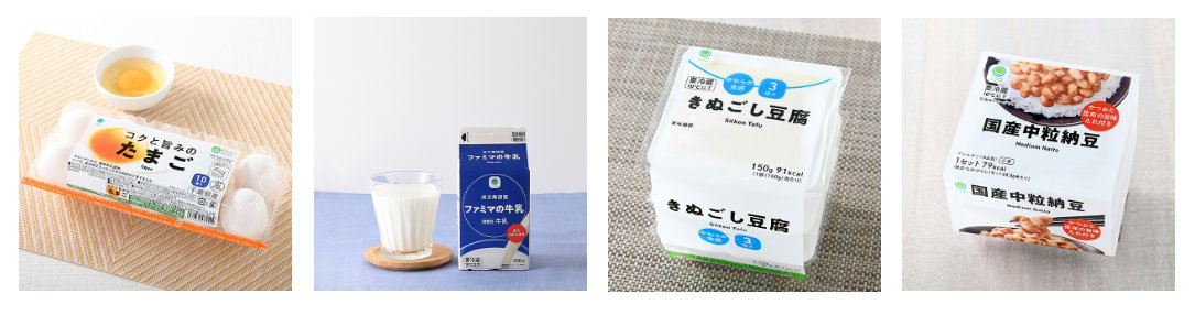 「コクと旨みのたまご 10個」は通常税込み価格345円を325円に、「ファミマの牛乳 500ml」は177円が157円に、「きぬごし豆腐3P」は128円が108円に、「かつおと昆布の旨味たれ付き 国産中粒納豆」は138円が118円に値下げしての発売となる。