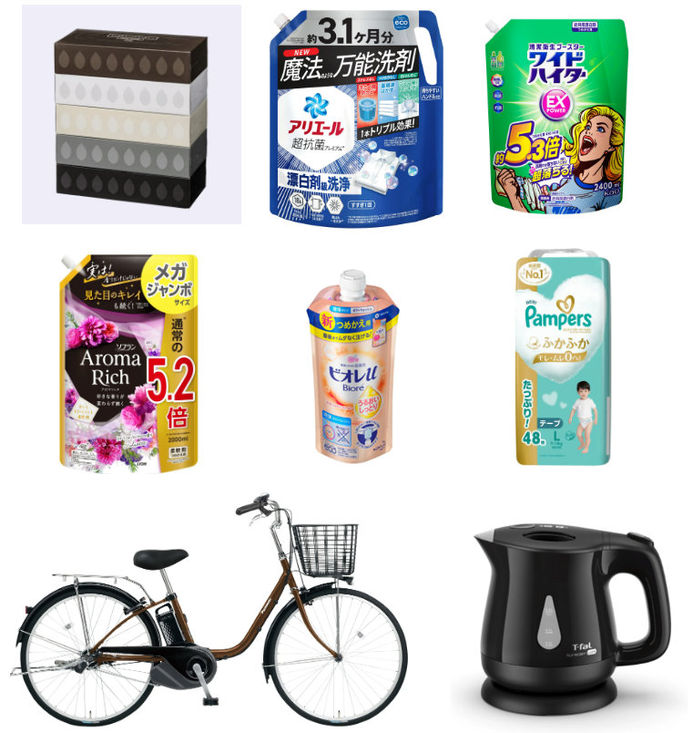「パナソニック 電動アシスト自転車 ビビYX特別仕様車」は7万9800円、「T-fal アプレシアロックブラック KO 5408JP」は2980円で販売する。