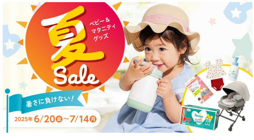 サマーセールでは、チャイルドシートやベビーベッドなどの大型ベビーグッズから、粉ミルクやベビーフード、ベビー服、マタニティ衣料などのマタニティ・ベビー用品まで幅広い商品を取り揃える。また、暑い夏を快適に過ごすためのベビーグッズや衣料、そのほか甚平・水着・ラップタオル・水遊びおむつを2点買うと20%OFFになるまとめ買いセールも実施する。