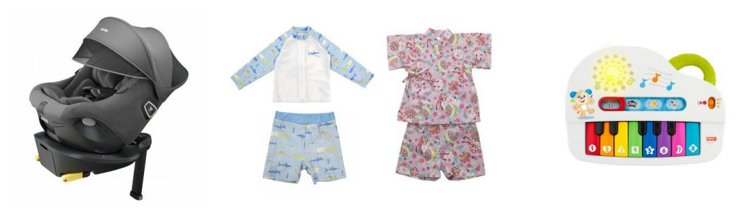 商品一例として、「アップリカ クルリラ プライト」通常販売価格6万4899円(税込価格、以下同)が5万4897円(1万0002円OFF)に、「甚平・水着・ラップタオル・水遊びおむつ」通常販売価格1699円~3999円が2点購入で20%OFF、「フィッシャープライス バイリンガル・わくわくピアノ」3520円が29%OFFの2497円で販売する。