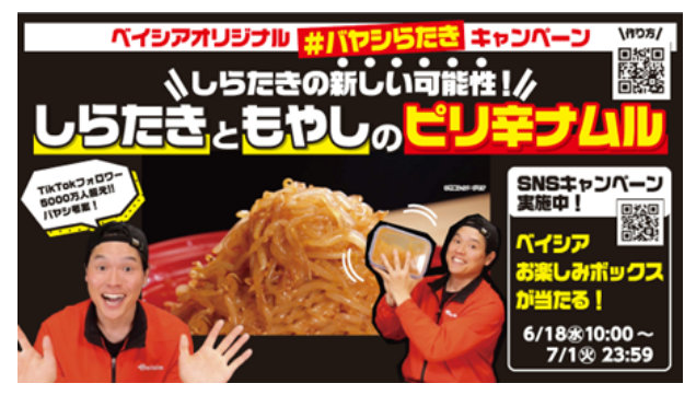 (株)ベイシア(群馬県前橋市、相木孝仁社長)は6月18日(水)から、人気動画クリエイター・バヤシさんとのコラボレーションによる「#バヤシらたき」キャンペーンを開始する。