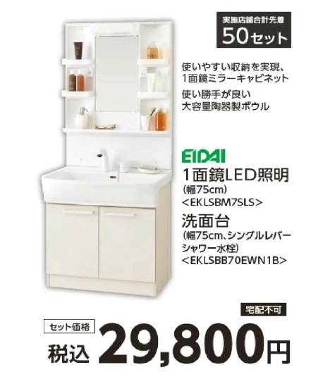 1面鏡ミラーキャビネットと使いやすい収納、使い勝手が良い大容量陶器製ボウル。実施店舗合計先着50セット。セット価格で2万9800円(税込価格、以下同)。