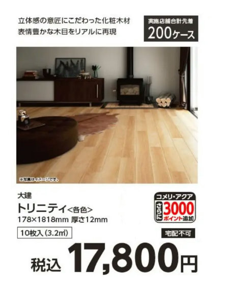 立体感の意匠にこだわった化粧木材。表情豊かな木目をリアルに再現。サイズは178×1818mm、厚さ12mm。実施店舗合計先着200ケース。価格は10枚入り(3.2㎡)で1万7800円。※コメリカード、アクアカード(プリペイド払い)でさらに3,000ポイント追加でプレゼント。