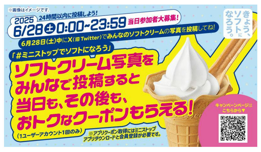 ミニストップ(株)(千葉市美浜区、藤本明裕社長)は、6月28日(土)0時~23時59分の間に、ミニストップ公式X(旧Twitter)にミニストップのソフトクリームの画像を投稿すると、最大無料となるデジタルクーポンがもらえる企画を実施する。