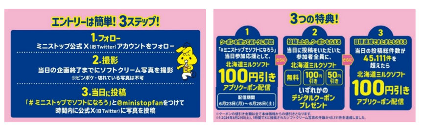 エントリー方法は、ミニストップ公式X(旧Twitter)アカウントをフォローし、ミニストップのソフトクリームの画像を「#ミニストップでソフトになろう」と「@ministopfan」をつけて投稿する。参加者全員に北海道ミルクソフトデジタルクーポン(無料・100円引き・50円引きいずれか)をプレゼントする企画となる。