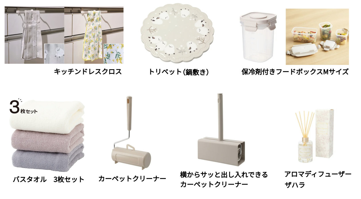 「キッチンドレスクロス」税込価格で399円(2025年4月28日 〜6月23日の同社販売価格は499円、以下同)、「トリベット (鍋敷き)」399円(499円)、「保冷剤付きフードボックスMサイズ」299円(399円)、「バスタオル 3枚セット」1690円(2025年8月20日 〜6月23日の同社販売価格は1790円)、「カーペットクリーナー」249円(2025年1月7日 〜6月23日の同社販売価格は299円)、「横からサッと出し入れできるカーペットクリーナー」399円(2025年1月7日 〜6月23日の同社販売価格は499円)、「アロマディフューザー ザハラ」899円(2023年12月12日 〜6月23日の同社販売価格は999円)などだ。