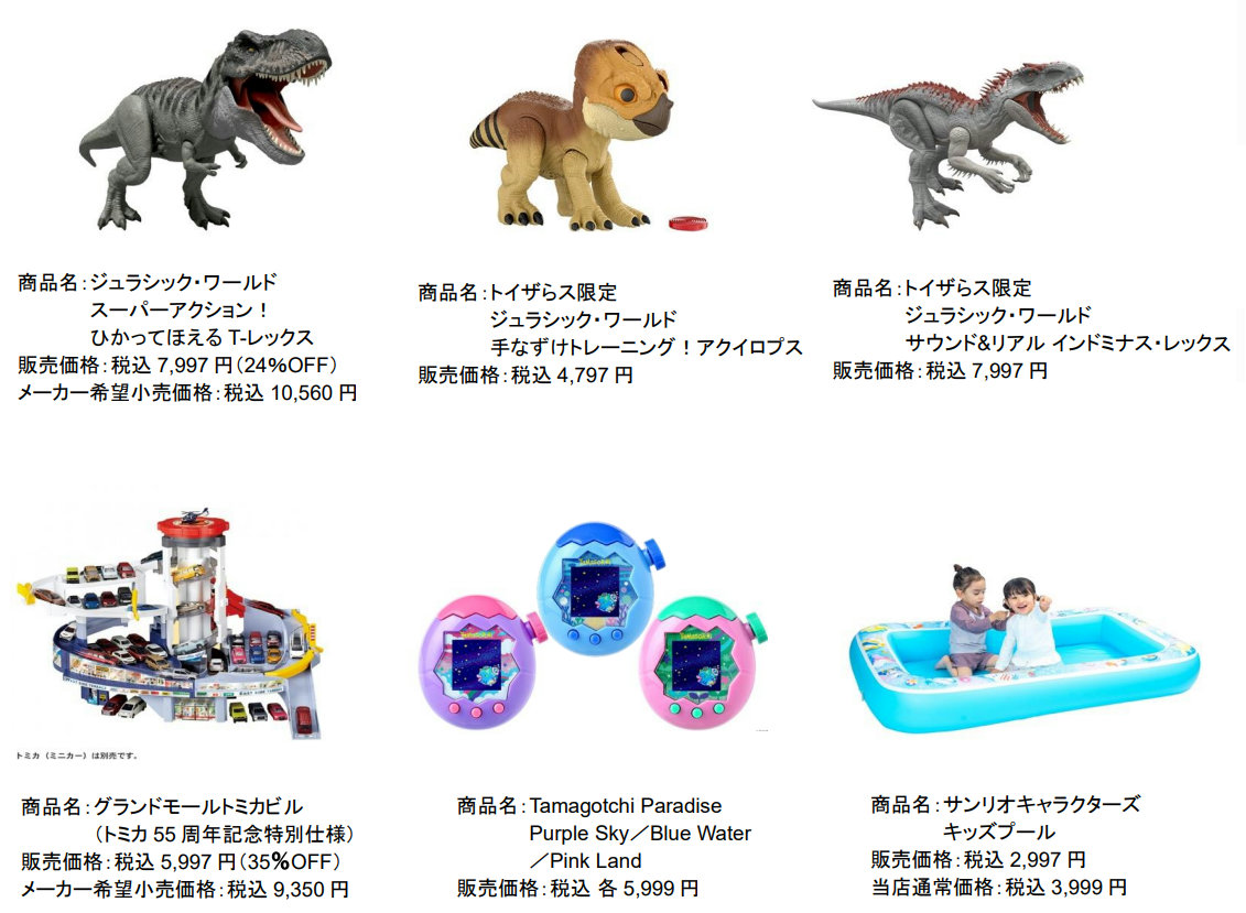 商品一例として、「ジュラシック・ワールドスーパーアクション!ひかってほえる T-レックス」メーカー希望小売価格1万560円(税込価格、以下同)が7997円(24%OFF)に、「グランドモールトミカビル(トミカ 55 周年記念特別仕様)」9350円が5997円(35%OFF)、「サンリオキャラクターズキッズプール」3999円が2997円などで販売する。