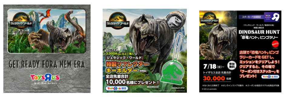 「ジュラシック・ワールド」フェアでは、「ジュラシック・ワールド」シリーズの公式商品を集めた特設コーナーの展開や、期間中「ジュラシック・ワールド」シリーズ公式商品を一回の会計で税込3000円以上購入すると、全店先着合計1万名限定で「特製リフレクターキーホルダー(非売品)」をプレゼントする。さらに、店頭では「恐竜ハント」ビンゴラリーカードを配布し、記載のミッションをクリアした全店先着合計3万名に、その場で「クーポン付きステッカー」をプレゼントするなどのイベントを開催する。
