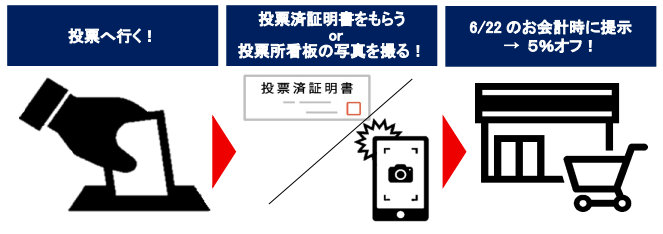参議院議員選挙の「投票済証明書」「投票所の看板写真」をレジで提示すると、購入金額から5%割引きとなる。期間中は何回でも利用が可能だ。