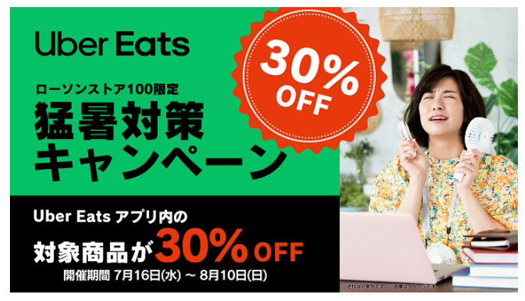 (株)ローソンストア100(東京都品川区、河原成昭社長)は7月16日(水)から8月10日(日)まで、Uber Eatsで対象商品が30%OFFとなる「猛暑対策キャンペーン」を開催する。
