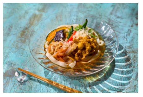 「成城石井自家製 和風だしをきかせた冷やしカレーきしめん」647円。きしめんに別添えのめんつゆをかけて混ぜ合わせ、上皿のカレーやトッピングをのせて食べる和風テイストの一品。だしとスパイスのバランスを試行錯誤し、きしめんによく絡むよう、カレーは硬さを調整しとろみを出している。カレーには鶏むね挽肉が入っているほか、トッピングには出汁で煮た油揚げ、オクラやかぼちゃ、なす、赤パプリカなどの野菜も彩り豊かな商品。