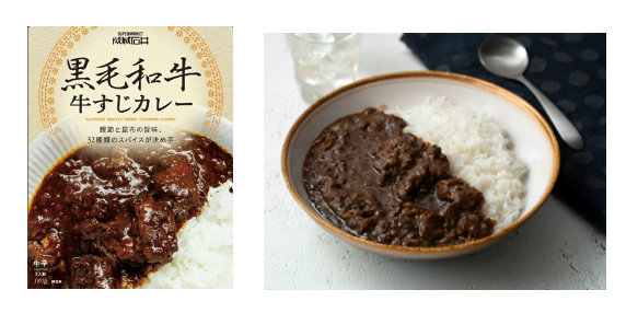 レトルトカレー「成城石井 黒毛和牛牛すじカレー 180g」755円。素材を十分に楽しめるよう、具材の牛すじには、黒毛和牛の牛すじのみを使用。クミンやコリアンダーといったスパイスを32種類使用することで奥行きのある香りを出しつつ、鰹節エキスや昆布エキスを使用し、全体でまとまりのある和風テイストの味わいに仕上げている。