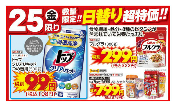 7月25日(金)・26日(土)・27日(日)の3日間「数量限定 日替り超特価商品」を販売する。対象商品には、お菓子や洗剤・日用品を中心に取り揃え、同セールでも一際目立つ超特価で販売する。