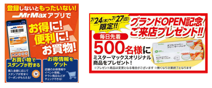 さらに7月24日(木)~7月27日(日)の4日間限定で、来店した顧客向けに毎日先着500名にミスターマックスオリジナル商品をプレゼントする。