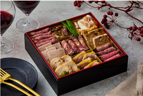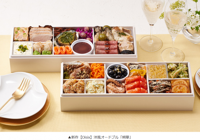 今年の新作である洋風オードブル「朔華(さっか)」はワインや祝い酒と一緒に楽しめる洋風オードブル。赤ワインの風味をきかせた「黒豆ワイン煮」や「数の子バジルチーズ和え」など、伝統的なおせち品目を、酒に合うようアレンジした。大晦日とお正月で1段ずつ分けて楽しめる、新しいコンセプトのおせち。
