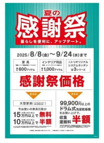 (株)ニトリ(札幌市北区、似鳥昭雄会長兼社長)は8⽉8⽇(金)から9月24日(水)までの期間、「ニトリ夏の感謝祭」を開催する。