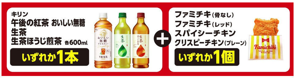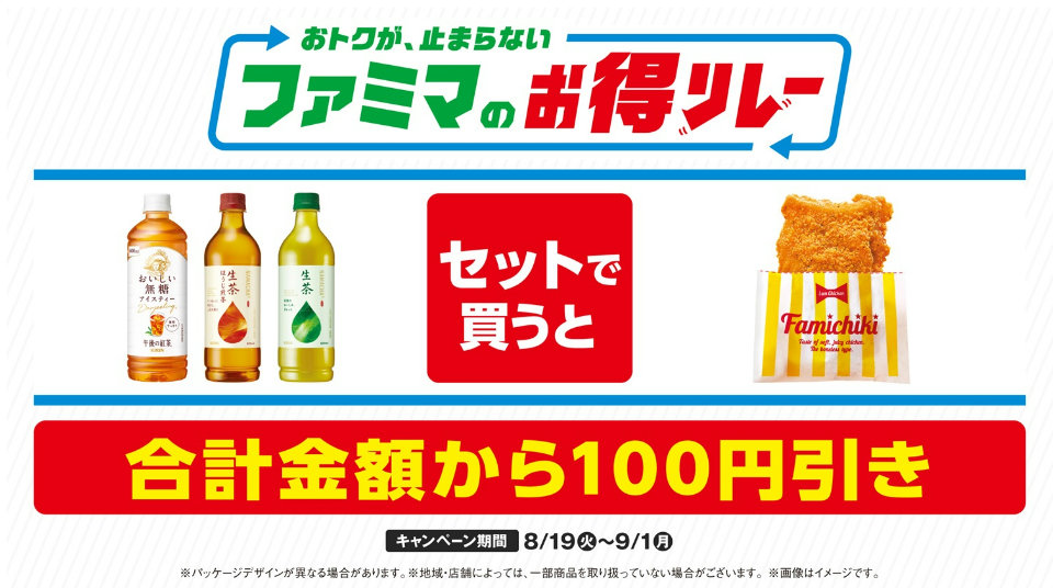 (株)ファミリーマート(東京都港区、細見研介社長)は、さまざまな商品がおトクになる「ファミマのお得リレー」の第4弾として、午後の紅茶おいしい無糖または生茶と対象のチキンを一緒に買うと合計金額から100円引きとなるキャンペーンを、8月19日(火)から9月1日(月)まで実施をする。