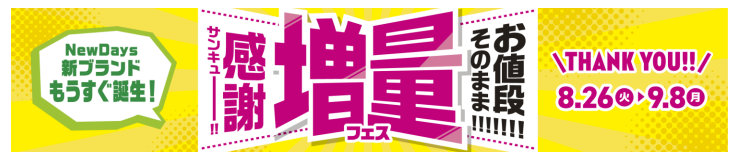 (株)JR東日本クロスステーション リテールカンパニー(東京都渋谷区、高橋徹カンパニー長)が運営する「NewDays」「NewDays KIOSK」は、8月26日(火)から9月8日(月)の期間、人気商品全15商品が値段そのままで増量となる「お値段そのまま!!!!!!!サンキュー!!増量フェス」を開催する。