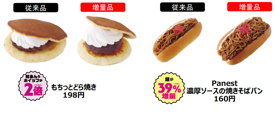 「もちっとどら焼き」は、粒あん&ホイップが2倍で登場。甘さ控えめで風味豊かな北海道きたろまん小豆の粒あんとホイップを、もちもち食感のどら焼き生地で挟んだ。本体価格は198円(以下同)。「Panest 濃厚ソースの焼きそばパン」は、麺が39%増量。しっとりとしたコッペパンに、濃厚ソースで味付けした焼きそばを挟み、追いソースとマヨネーズ、紅生姜をトッピングした。価格は160円。