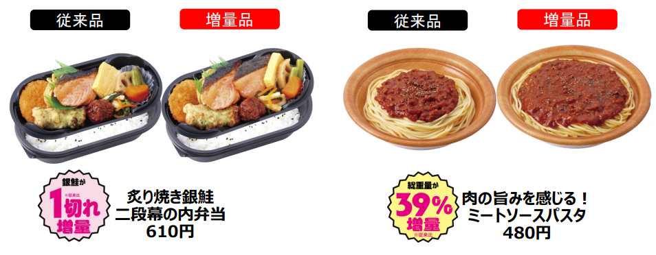 「炙り焼き銀鮭二段幕の内弁当」は、銀鮭が1切れ増量。脂がのった銀鮭とコロッケやちくわの磯辺揚げ、肉団子、玉子焼き、野菜の煮物とバラエティ豊かな和風のおかずが味わえる二段幕の内弁当。価格は610円。「肉の旨みを感じる!ミートソースパスタ」は、総重量が39%増量。食べ応えのあるもちっと食感の麺と、肉感のあるミートソースを合わせた定番パスタ。価格は480円。