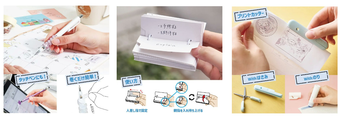 タイパ抜群のパフォーマンスUP商品からは、細軸でも太軸でも、ボールペンやタッチペンなどにくるくる巻けるプニュっと感触の「ペンシルグリップ」448円や、片手でサクッと勉強できる「クツワ ワンハンド単語カード(大・小)」 348円、1本2役の便利アイテム「ソニック オレパ withはさみ」798円、「ソニック オレパ withのり」448円などを展開する。