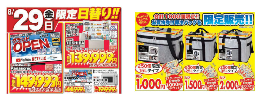 8月28日(木)からは、販売金額と同額の買物券がついてくる、実質無料の保冷バッグを1000個限定で販売。また8月29日(金)から31日(日)の3日間は、数量限定の日替り商品を販売する。さらにMrMaxアプリ会員限定価格商品なども用意して開催する。