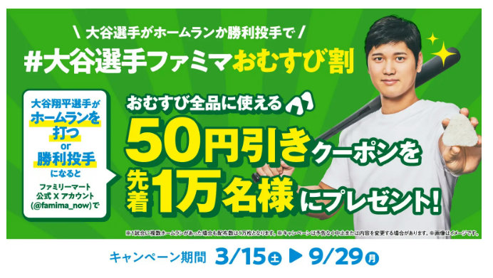 ファミリーマートは、大谷選手がホームランを打つと、試合終了後にファミリーマート公式Xアカウント@famima_nowで、おむすび全品に使える50円引きクーポンを先着1万名にプレゼントしており、これまで通算42万枚を配布している。