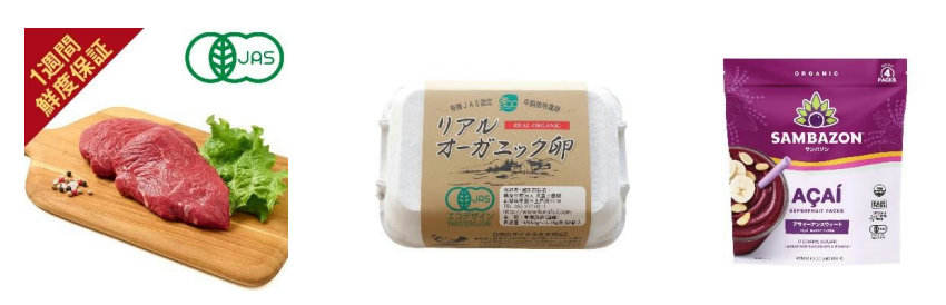 「[鮮度+]【冷蔵】オーストラリア産 オーガニックビーフももステーキ用(ランプ) 170g~230g」は、抗生物質や成長ホルモンを使わず、ストレスの少ない環境で大切に育てられたオーガニックビーフ。200gで1496円(本体価格、以下同)。「リアルオーガニック卵」は環境、えさ、飼養方法、全てにこだわった商品。6個入りで758円。「サンバゾン有機アサイースーパーフルーツパックピュアアンスウィート 砂糖不使用」は、ポリフェノールや食物繊維が含まれる有機アサイー。フェアトレードを取得。4袋入(100g ×4) で998円。