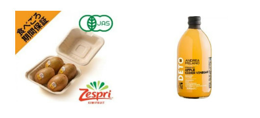 「[食べごろ+]【有機】ニュージーランド産ゼスプリ サンゴールドキウイフルーツ」は、届いたその日から「食べごろ」を約束する商品。4個入り400gで698円。「アンドレアミラノ 有機リンゴ酢」は、リンゴジュースをろ過せずに発酵させて作った香り豊かなお酢。 500mlで498円。