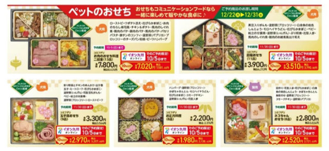 イオン九州(株) (福岡市博多区、中川伊正社長)は9月1日(月)から、ホームワイド各店と「イオン九州オンライン」で、ペットと飼い主が一緒に楽しめる「クリスマスケーキ」や「おせち料理」の予約受付を開始している。