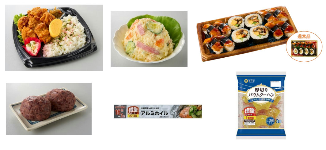 増量セール商品では、「唐揚げ弁当50%増量(4個+2個)」583円(税込価格、以下同)、「ハムポテトサラダ 50%増量(190+95g)」323円、「魚優の鰻づくし(鰻にぎり3貫増量)」1059円、「アルミホイル25cm×16m(2m増量)」219円などの商品を用意。