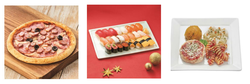 ラインアップは全66種類。内訳はクリスマスケーキ25種類、アイスデザート3種類、クリスマスチキン9種類、ローストレッグ2種類、パーティーメニュー7種類、ピザ4種類、寿司2種類、スパークリングワイン11種類、ペットグルメ3種類。