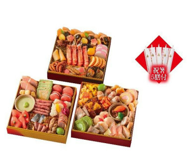 「親子三世代おせち宝来三段重」は、4~5人前で60品目を盛り込んだ。家族がそろう集いの席にぴったりのバラエティ豊かな三段重おせち。価格は1万8500円。