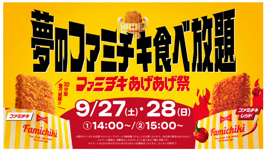 また「あげあげ祭」の一環として、看板商品「ファミチキ」を思う存分楽しめる、ファミチキの食べ放題企画「ファミチキ あげあげ祭 ~夢のファミチキ食べ放題~」を、全国10ヵ所のファミリーマート店舗で、9月27日(土)と9月28日(日)に開催する。