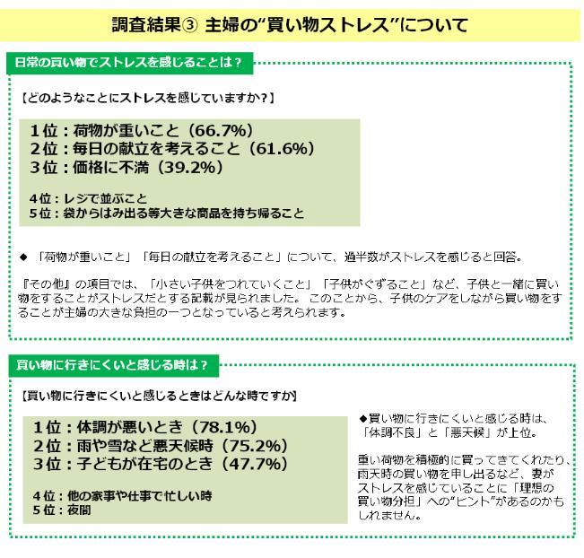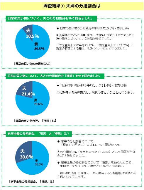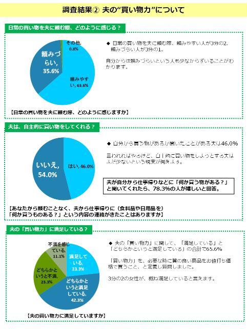 そこで生団連では「普段の行動のちょい足しからの家事参加」を提唱するために、「買エルマンキャンペーン」を立ち上げた。生団連が実施した子育て世代の女性の声の調査結果(20代から30代の女性480人にインターネット調査)は、夫婦の買物行動の実態を表していて面白いので掲載する。