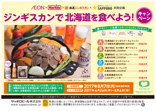 イオングループのイオン北海道(株)、マックスバリュ北海道(株)は、6月26日(月)から8月6日(日)まで「ジンギスカンで北海道を食べよう!」キャンペーンを実施する。サッポロビール(株)と松尾ジンギスカンの(株)マツオとの共同企画。