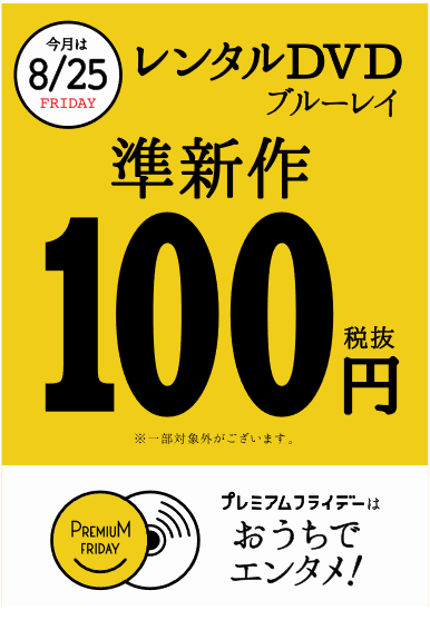 実施内容/レンタルDVD・ブルーレイ準新作を100円(税別)でレンタル(7泊8日、延滞料金あり)アダルト作品除外