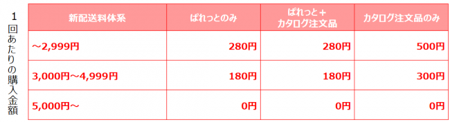 第1は、従来、自社便配送料金が0円となるのは、8000円以上の購入金額の場合であったが、これを5000円以上と基準を引き下げる。また従来の5段階の配送料を3段階に絞り、よりわかりやすくした。