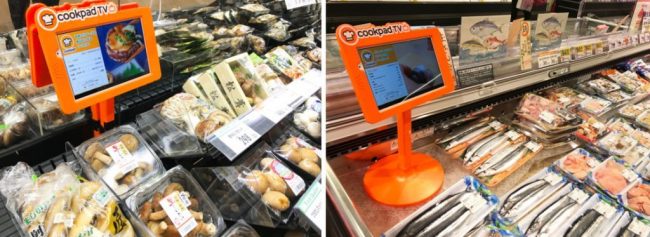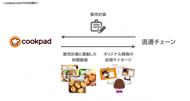 店舗の生鮮売場に、クックパッドがオリジナル開発したサイネージ端末を設置し、店舗の販売計画と連動した料理動画を配信していく。お客に食材・商品の調理法や使い方を店頭の料理動画で見せることで商品の購買につなげていく。