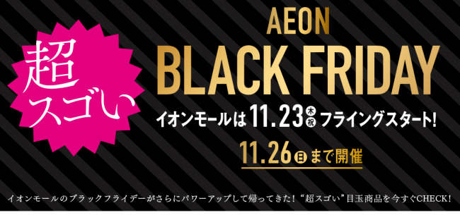 イオン(株)(千葉市、岡田元也社長)は、昨2016年に実施した「イオン ブラックフライデーセール」を今年は11月24日(金)から11月26日(日)までの3日間開催する。さらに前日の11月23日(木)の勤労感謝の日には、「イオン ブラックフライデー フライングセール」を実施する。