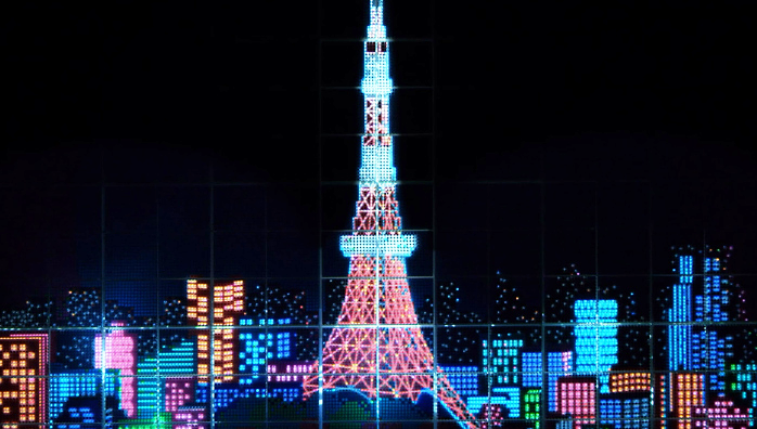 さらにプロジェクションマッピングを用いて、カラフルに変化する東京を表現する。