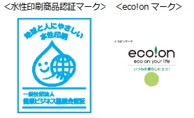 水性グラビア印刷の商品は、一般社団法人健康ビジネス協議会の「水性印刷商品認証制度」の対象となり、「水性印刷商品認証マーク」とともに、環境に配慮した同社オリジナル商品に付いている「eco!on(エコオン)」マークも一緒に表示する。