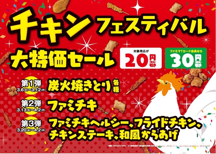 「チキンフェスティバル」は3弾にわたって連続的に行われ、対象商品が20円引きとなる。さらにファミマT会員は30円引きだ。