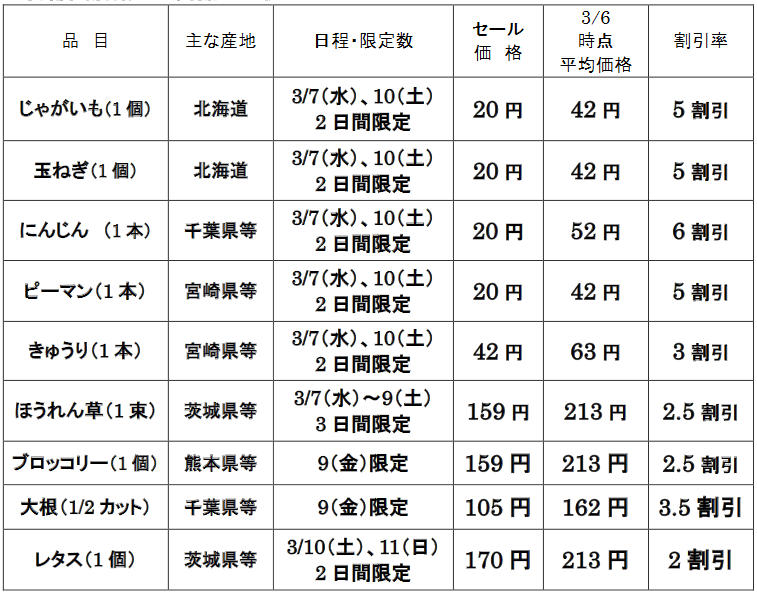 首都圏店舗では、北海道産ジャガイモ1個42円を5割引きの20円、千葉県産ニンジン1本52円を6割引きの20円で販売する。茨城県産レタスは1個213円が2割引きの170円と、200円の大台を切る売価設定だ。