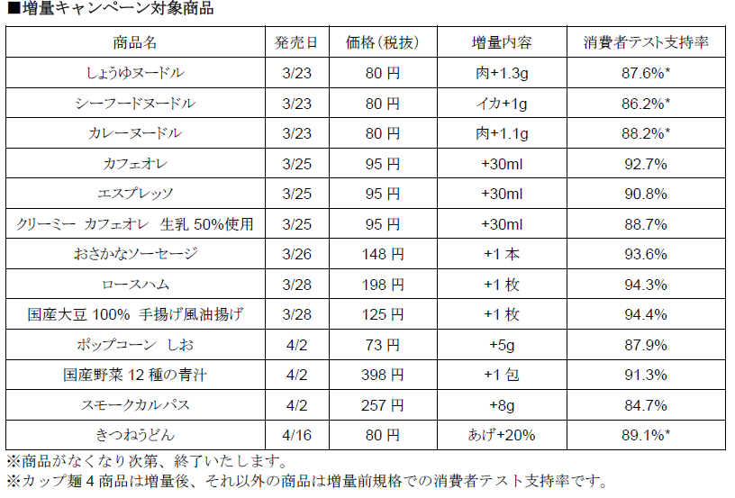 ボリュームアップ「増量キャンペーン」は、「カフェオレ」(30ml量)、「ロースハム」(1枚増量)をはじめとする実質値下げとなる商品に加えて、「しょうゆヌードル」(味付き挽肉増量)など、人気の全13品目を値段はそのままで、通常より増量して販売する。