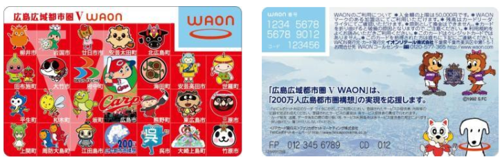 カードには、広島市を本拠地とする広島東洋カープ(以下、カープ)のマスコットキャラクター「カープ坊や」を中心に24市町のイメージキャラクターがデザインされている。また、もう一方の面には、サンフレッチェ広島のマスコットキャラクター「サンチェ」と「フレッチェ」、広島広域都市圏のマスコットキャラクター「ひろしま都市犬はっしー」がデザインされている。