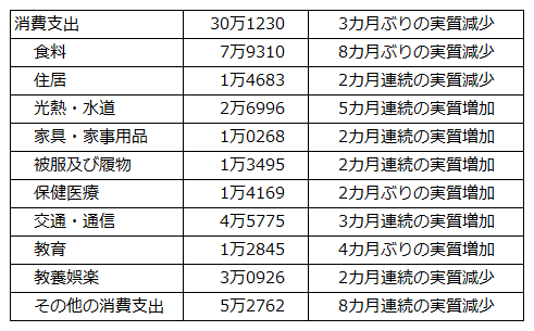 2人以上の世帯の消費支出は30万1230円。前年同月比は、物価変動の影響を除いた値「実質」は0.2%減少で3カ月ぶりに前年を下回った。そのままの値「名目」では1.1%増加した。また前月比(季節調整値)は0.1%の減少。