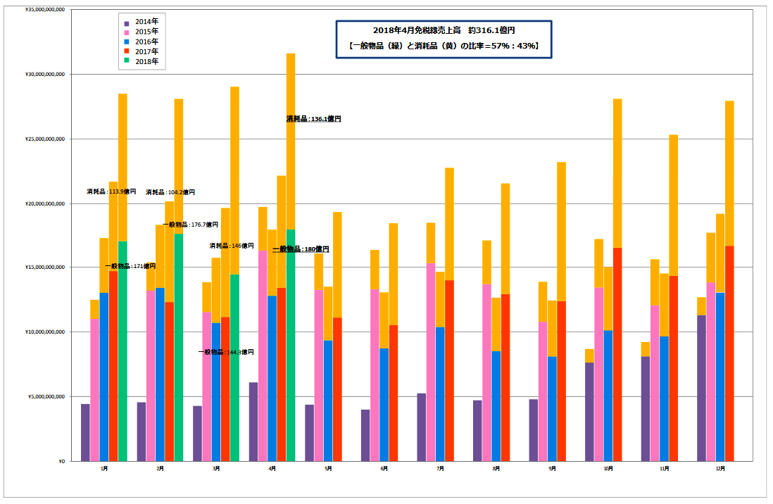 免税総売上高は316億1000万円で、初めて単月で300億円を突破した。前年同月比は42.9%増と17カ月連続で前年を上回っている。このうち、一般物品は180億円で34.4%増、消耗品(化粧品・食料品等)は136億1000万円で56.1%増だった。