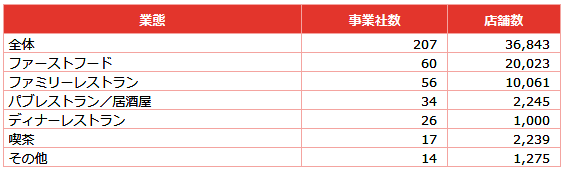 業態別に集計したこの調査は、新店を含めた全店を対象にしている。4月末時点で、調査対象は207社、店舗数3万6843店。3月に比べて事業社は7社、店舗は484店増加した。